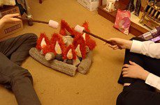 One day Kate arrived with a large box under her arm. Unpacking it revealed all the elements to build a campfire in our living room! Every piece had been hand knitted, even down to the marshmallows for toasting!
